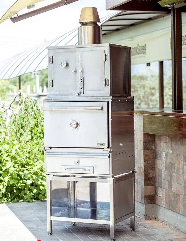 Отработанная зола собирается в выдвижной зольный ящик. Чтобы меньше грелись боковые облицовки – между ними и камерой проложен утеплитель. Регулировка температуры в печи производится верхним шибером и зольным ящиком (выдвижением). Предусмотрена установка на хоспер печи для пиццы, коптильни для горячего копчения, решетки для отдыха мяса или теплового шкафа.