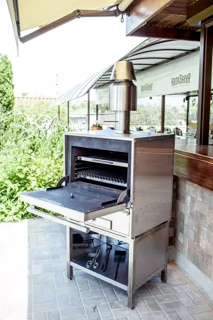 Отработанная зола собирается в выдвижной зольный ящик. Чтобы меньше грелись боковые облицовки – между ними и камерой проложен утеплитель. Регулировка температуры в печи производится верхним шибером и зольным ящиком (выдвижением). Предусмотрена установка на хоспер печи для пиццы, коптильни для горячего копчения, решетки для отдыха мяса или теплового шкафа.